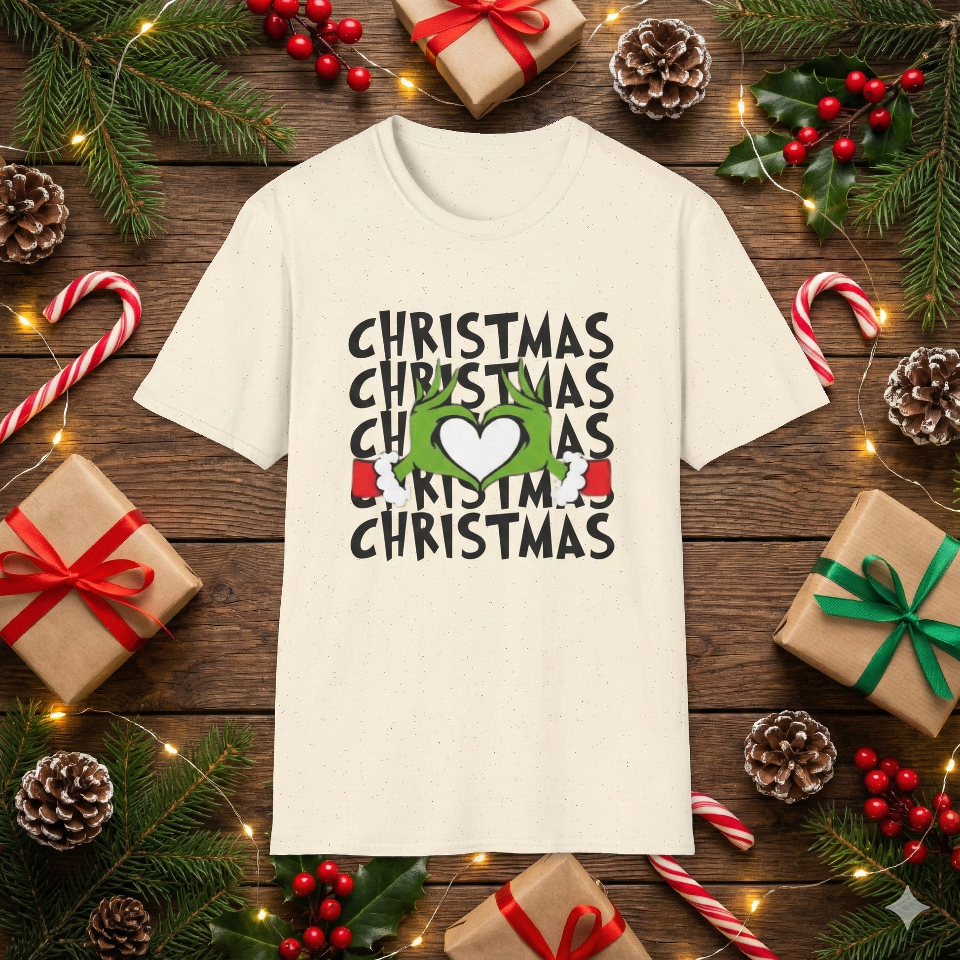 Christmas Grinch Heart T-Shirt — Festive Holiday Graphic Tee, Funny Green Hand Christmas Tee