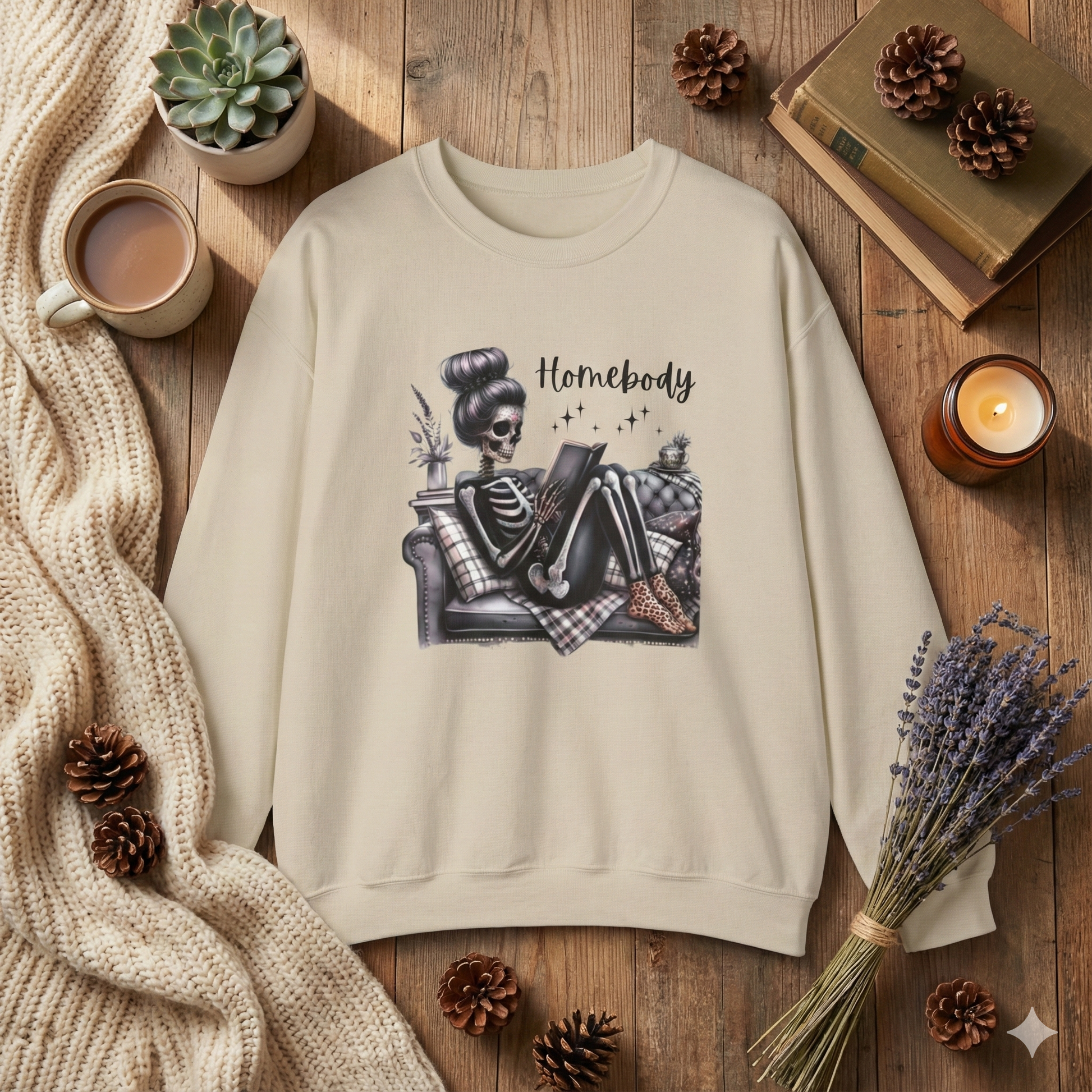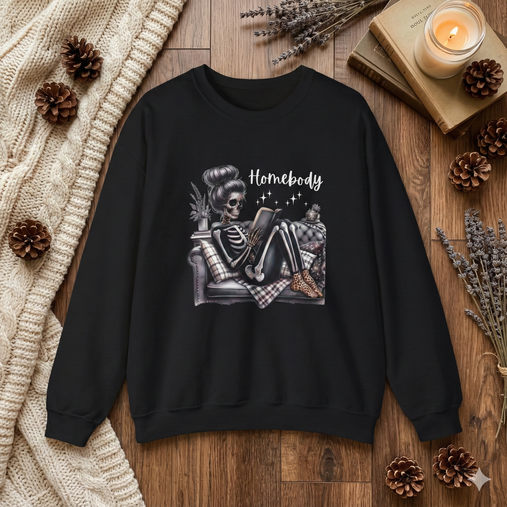 Get cozy with some spooky vibes! This Homebody Skeleton Sweatshirt is perfect for anyone who loves staying in, reading, and embracing their introverted side with a little gothic charm. Featuring a stylish skeleton girl lounging on a couch with a book, this design blends cute, creepy, and cozy all in one.